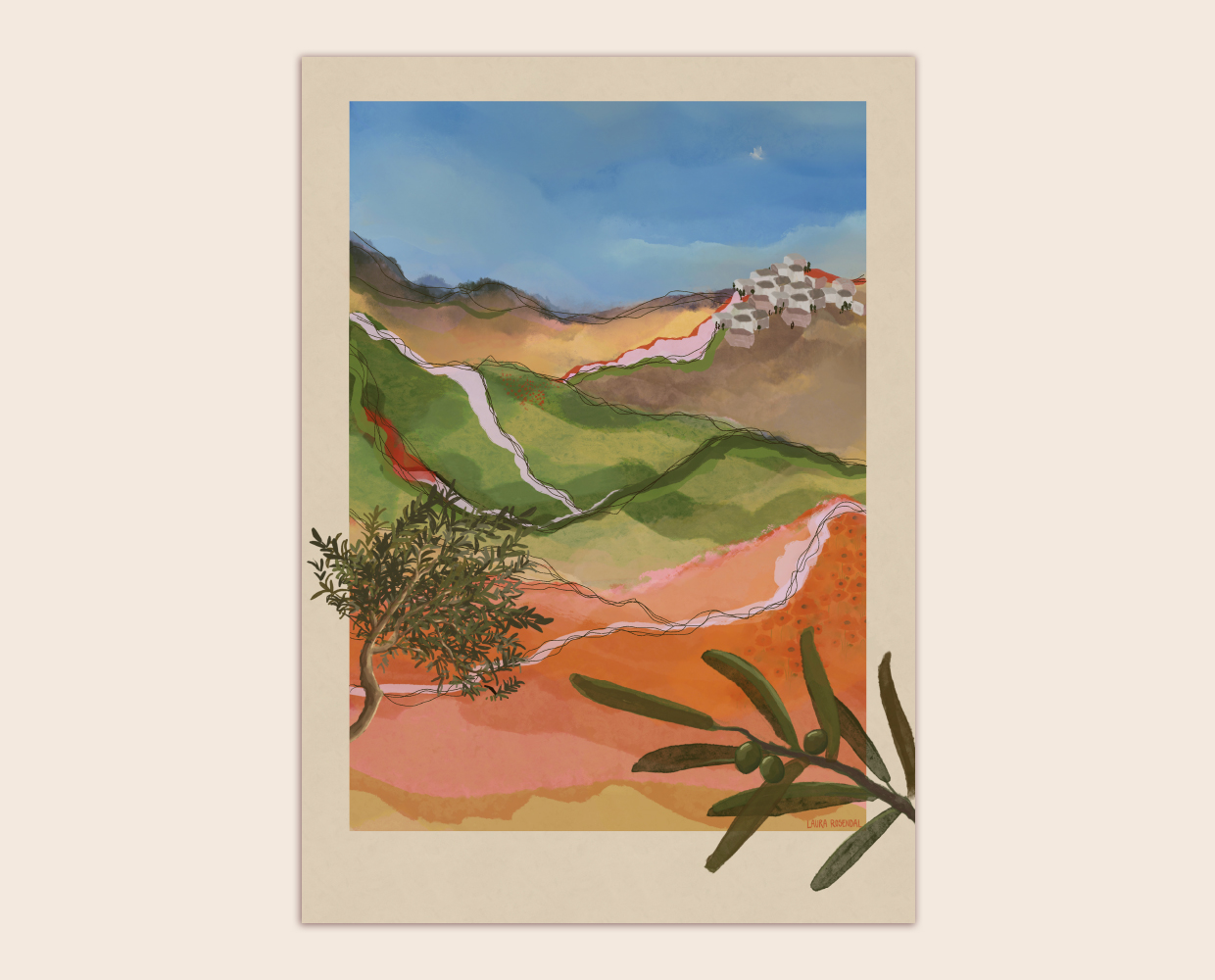 Illustrationen er inspireret af mine egne erindringer og fotografier fra min rejse til Palæstina i 2017, som uden tvivl satte sine spor hos mig. Først og fremmest på grund af den varme og gæstfrihed, som vi mødte hos de lokale - selv på trods af de vilkår, de lever under. Dette ville jeg gerne udtrykke som et minde om, hvor smukt et land, et folk og en kultur vi skal passe på.